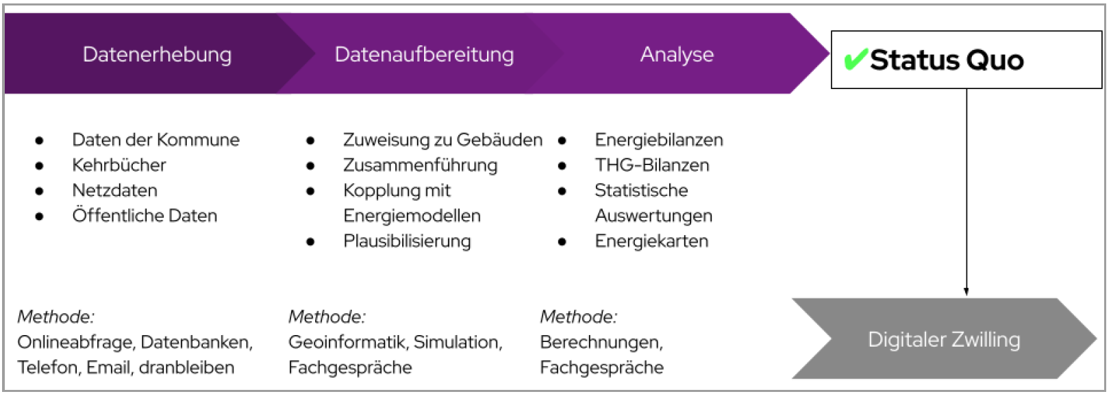 Die Grundlage der kommunalen Wärmeplanung ist ein Verständnis der Ist-Situation sowie eine umfassende Datenbasis. Letztere wurde digital aufbereitet und für die Analyse des Bestandes genutzt. Hierfür wurden zahlreiche Datenquellen zusammengeführt, aufbereitet, integriert und den an der Erstellung der kommunalen Wärmeplanung Beteiligten zugänglich gemacht. Die Bestandsanalyse bietet einen umfassenden Überblick über den gegenwärtigen Energiebedarf, die Energieverbräuche, die Treibhausgasemissionen sowie die bestehende Infrastruktur.