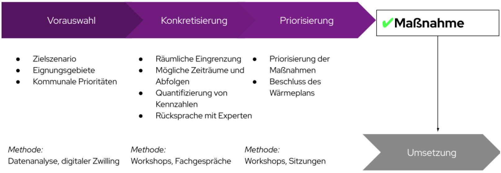 Die Maßnahmen bilden den Kern des Wärmeplans und markieren den Einstieg in die Transformation hin zum angestrebten Zielszenario. Diese Maßnahmen können sowohl „harte“ Maßnahmen mit messbarer CO₂-Einsparung, wie etwa die Dekarbonisierung der Erzeugung, als auch „weiche“ Maßnahmen, beispielsweise in der Öffentlichkeitsarbeit, umfassen. Grundlage für die Auswahl der quantitativen Maßnahmen waren die Erkenntnisse aus der Bestands- und Potenzialanalyse. In Kombination mit dem Fachwissen beteiligter Akteure (Industrie, Wohnungsbaugesellschaften etc.), greenventory, der DVV und Tochtergesellschaften (Stadtwerke, Fernwärme, Netzgesellschaft) sowie der lokalen Expertise der Stadtverwaltung wurde der Handlungsspielraum so eingegrenzt, dass vielfältige Maßnahmen identifiziert werden konnten.